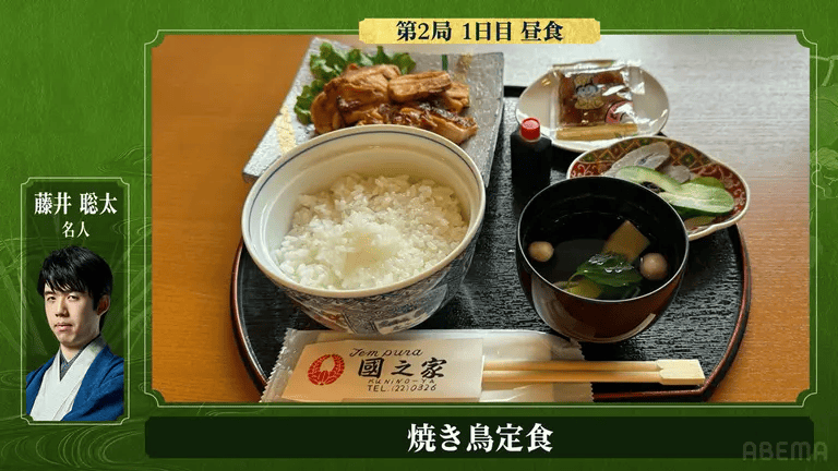 藤井聡太名人點的雞肉串定食。來源:Abema TV(作者每次看到棋士嚴肅的臉配上餐點,都會笑出來)