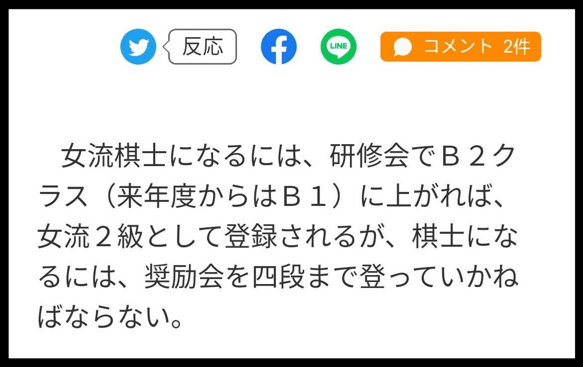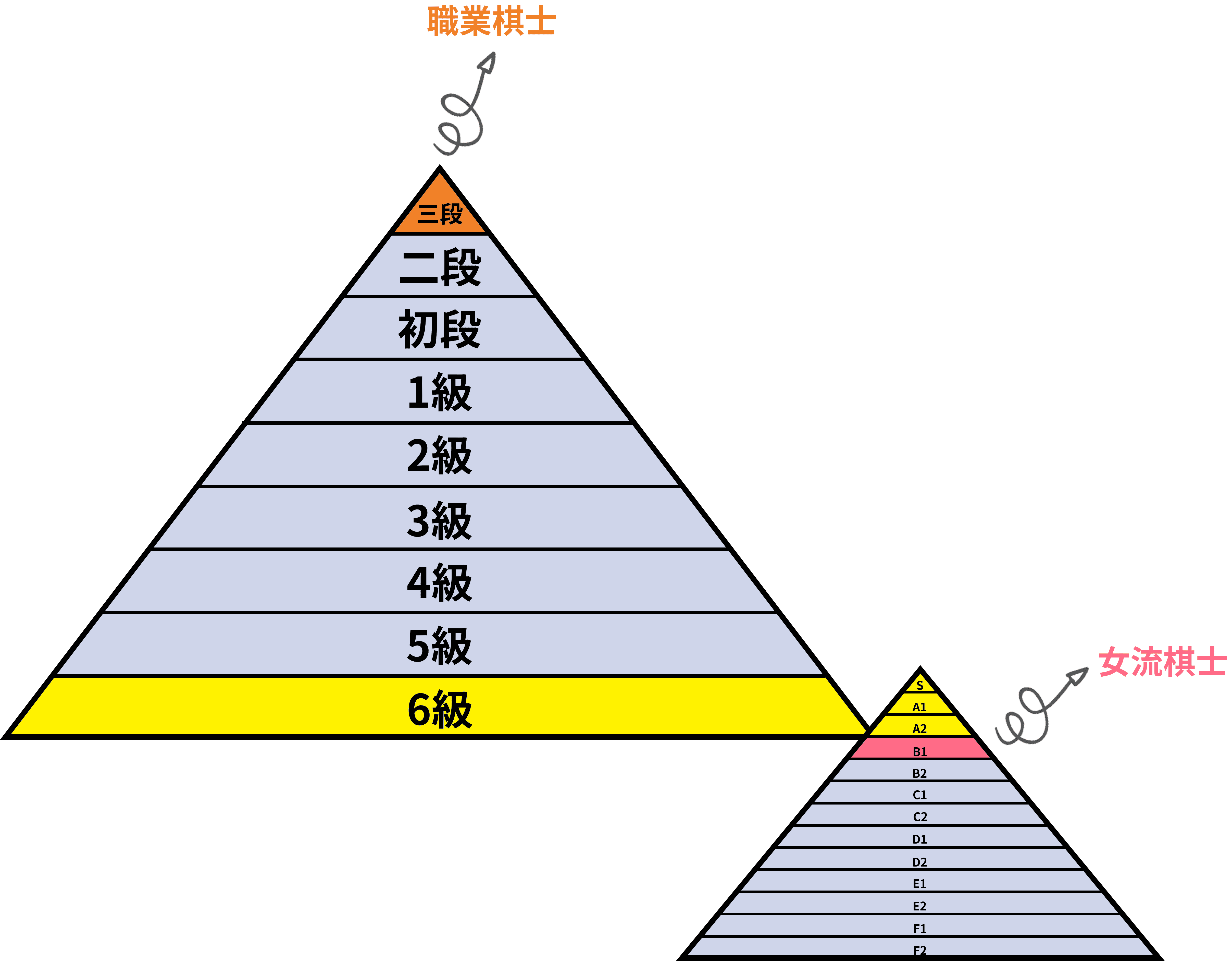 「女性棋士」是職業棋士,必須在三段聯賽中通穎而出;「女流棋士」則需要在研修會達成 B1 級別。也就是說,即便是一位獎勵會 6 級的棋手,棋力也高於絕大多數的女流棋士,何況是通過三段聯賽的職業棋士。
