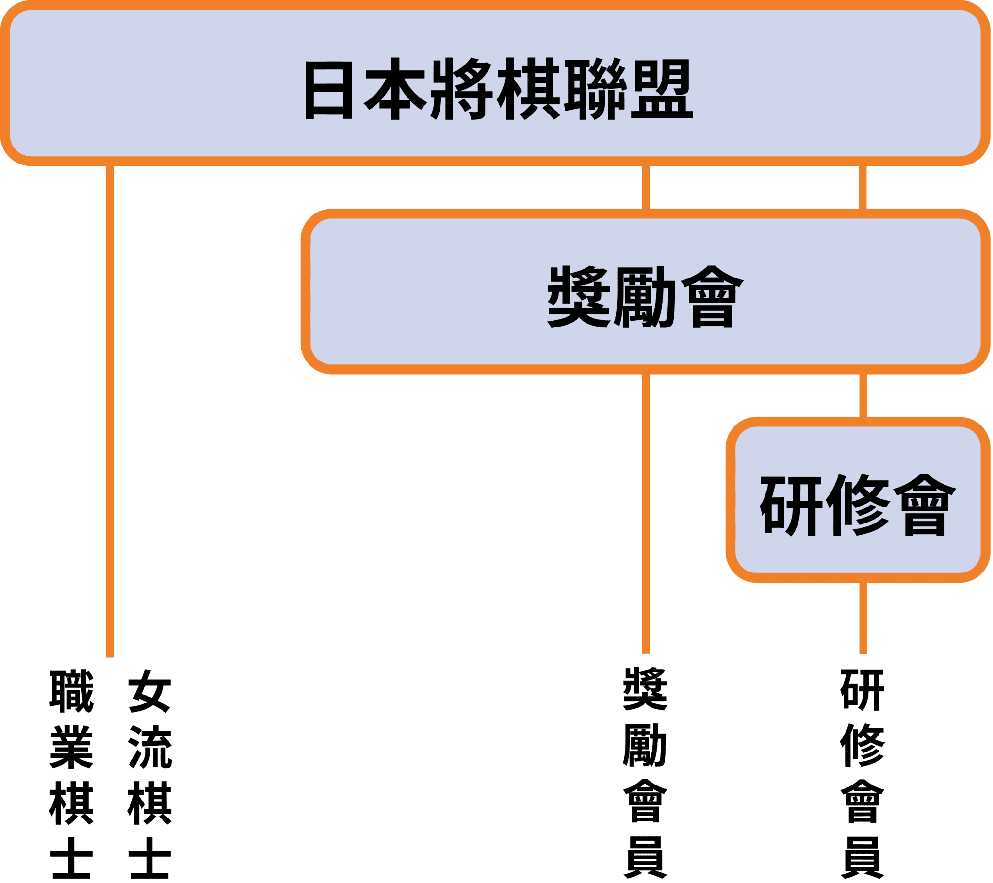 日本將棋聯盟內部由許多組織組成,這裡僅列出會影響我們了解女流棋士與職業棋士的主要組織。分別是研修會、獎勵會與棋士會。