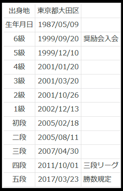 藤森哲也五段的昇段級表。來源:将棋棋士成績 DB