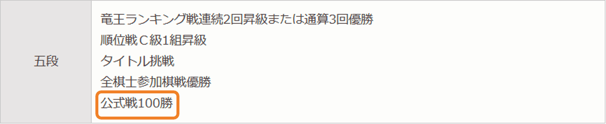 以下的圖片顯示職業五段的昇段條件,其中之一是成為職業四段後,達成