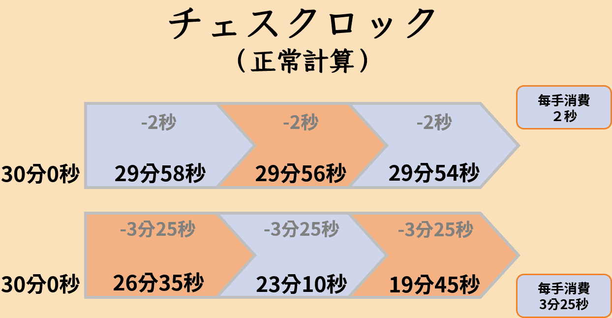 チェスクロック (chess clock):正常計算時間,無捨去花費時間或增加秒數機制。