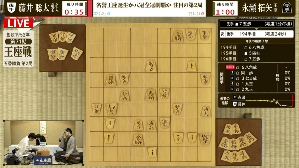 來源:Abema TV圖片為第 71 期王座戰的盤面。先手是永瀨拓矢王座,是被挑戰的一方,持有頭銜,所以持王將。(通常的對局視線會以先手方的視線來展示,意味著盤面下方的位置是先手)